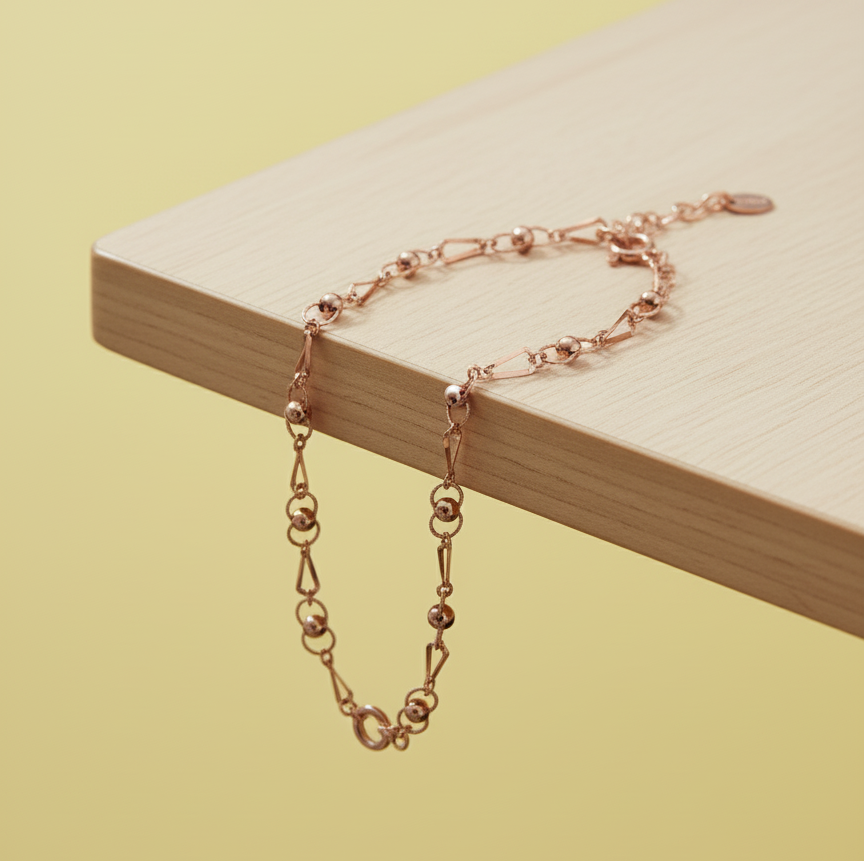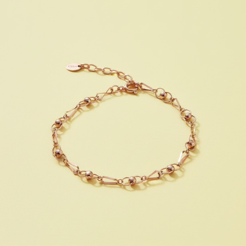 This elegant rose gold bracelet offers a delicate touch of sophistication to any ensemble. Crafted with shimmering links and small, brilliant accents, it catches the light beautifully. The adjustable chain ensures a perfect fit, making it a versatile piece for daily wear or special occasions. Its timeless design and warm metallic hue exude understated luxury, making it an ideal gift or a cherished addition to your own jewelry collection.