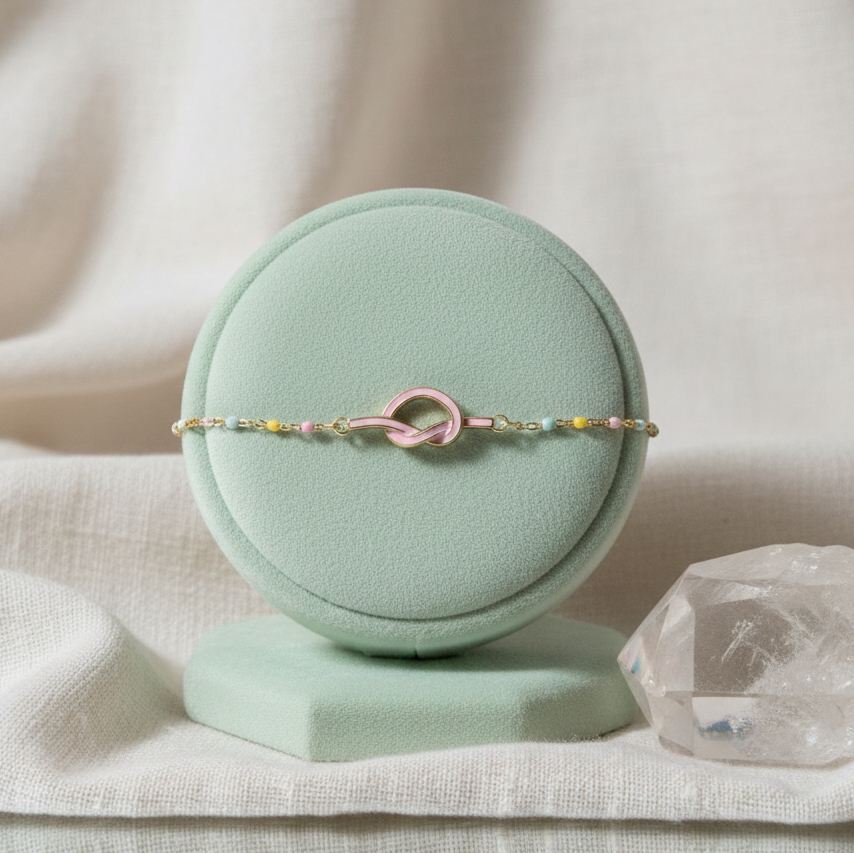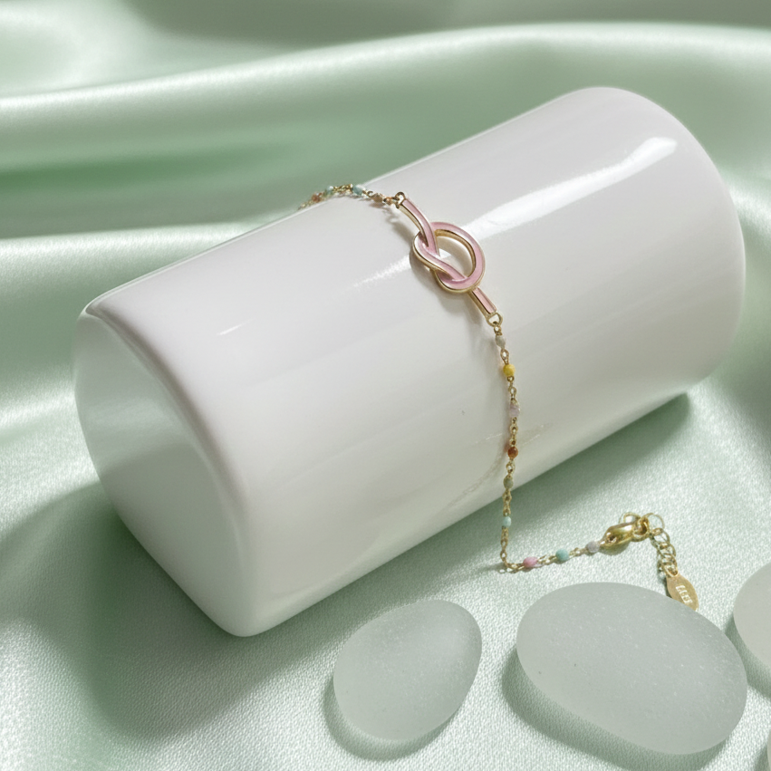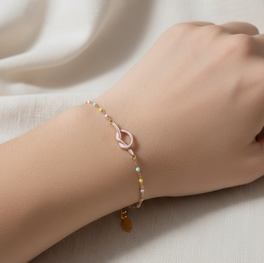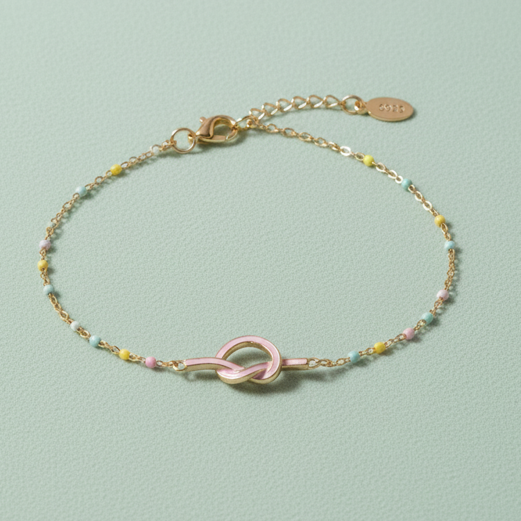 This charming bracelet features a delicate golden chain adorned with a rainbow of colorful beads, culminating in a sweet, pink-enameled knot. The "Everlasting Knot" symbolizes unbreakable bonds and enduring style, making it the perfect gift for a loved one or a meaningful treat for yourself. Its minimalist design ensures versatility, allowing it to complement any outfit, from casual daywear to elegant evening attire. Crafted with meticulous attention to detail, this piece adds a subtle pop of color and a touch of sentiment to your everyday look.