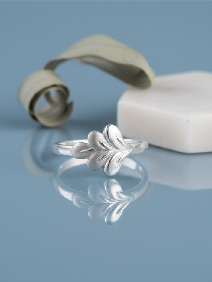 This elegant ring, crafted with a delicate interplay of polished and matte silver, captures the subtle beauty of nature. Its intricate leaf design creates a captivating texture, offering a unique visual appeal. "Leaf Whisper" is a versatile piece that adds a touch of sophisticated charm to any ensemble, perfect for those who appreciate understated elegance and distinctive craftsmanship.