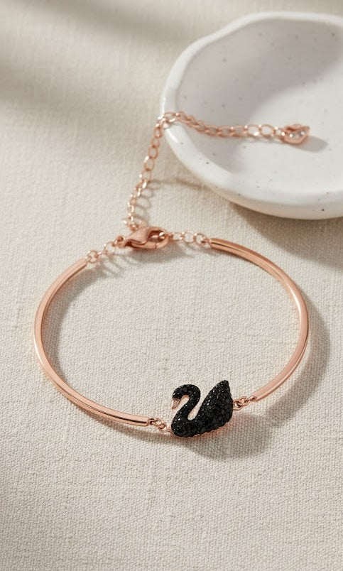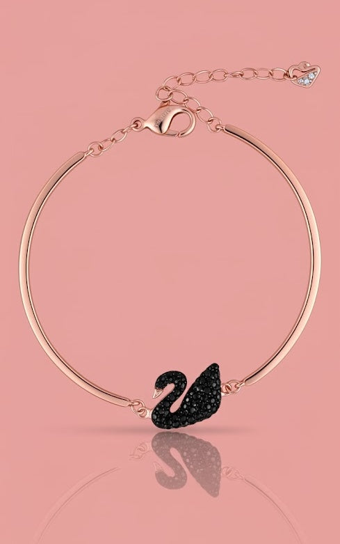 This elegant rose gold-toned bracelet features a stunning black swan motif, intricately embellished with shimmering zirconia stones. The sleek design and delicate chain make it a perfect accessory for both everyday wear and special occasions. Its timeless appeal and sophisticated charm add a touch of grace to any outfit, celebrating the beauty of fine craftsmanship and elegant simplicity.